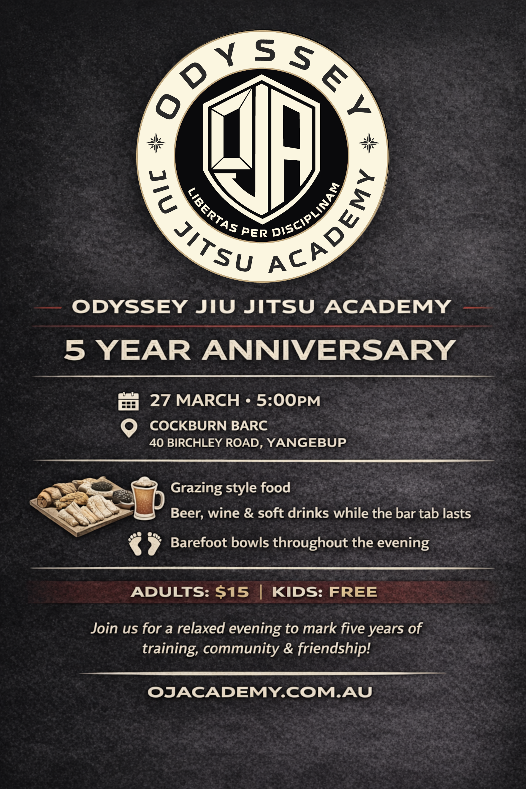 We’re celebrating five years of Odyssey Jiu Jitsu Academy with a relaxed evening for members, families, and close friends.